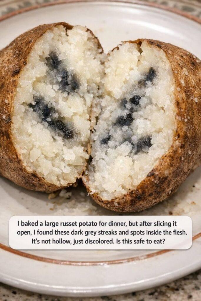 I baked a large russet potato for dinner, but after slicing it open, I found these dark grey streaks and spots inside the flesh. It’s not hollow, just discolored. Is this safe to eat?